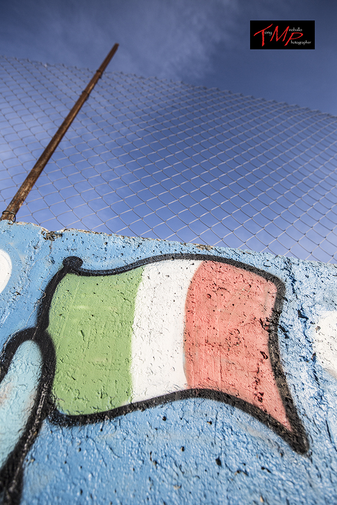 Per me che fotografo quasi esclusivamente in bianconero,mettere un’immagine a colori è una cosa rara,ma qui avevo necessità che si vedessero i colori del nostro paese…Questa per me è l’Italia.Un bandiera che in realtà non è altro che una rete di recensione dove idee,valori e umanità vengono reclusi.Ed ecco che l’asta della bandiera è la stessa asta che recinta il cielo azzurro.Un paese svenduto,che finge la sua libertà dalla peggiore delle prigioni,quella dell’ipocrisia…